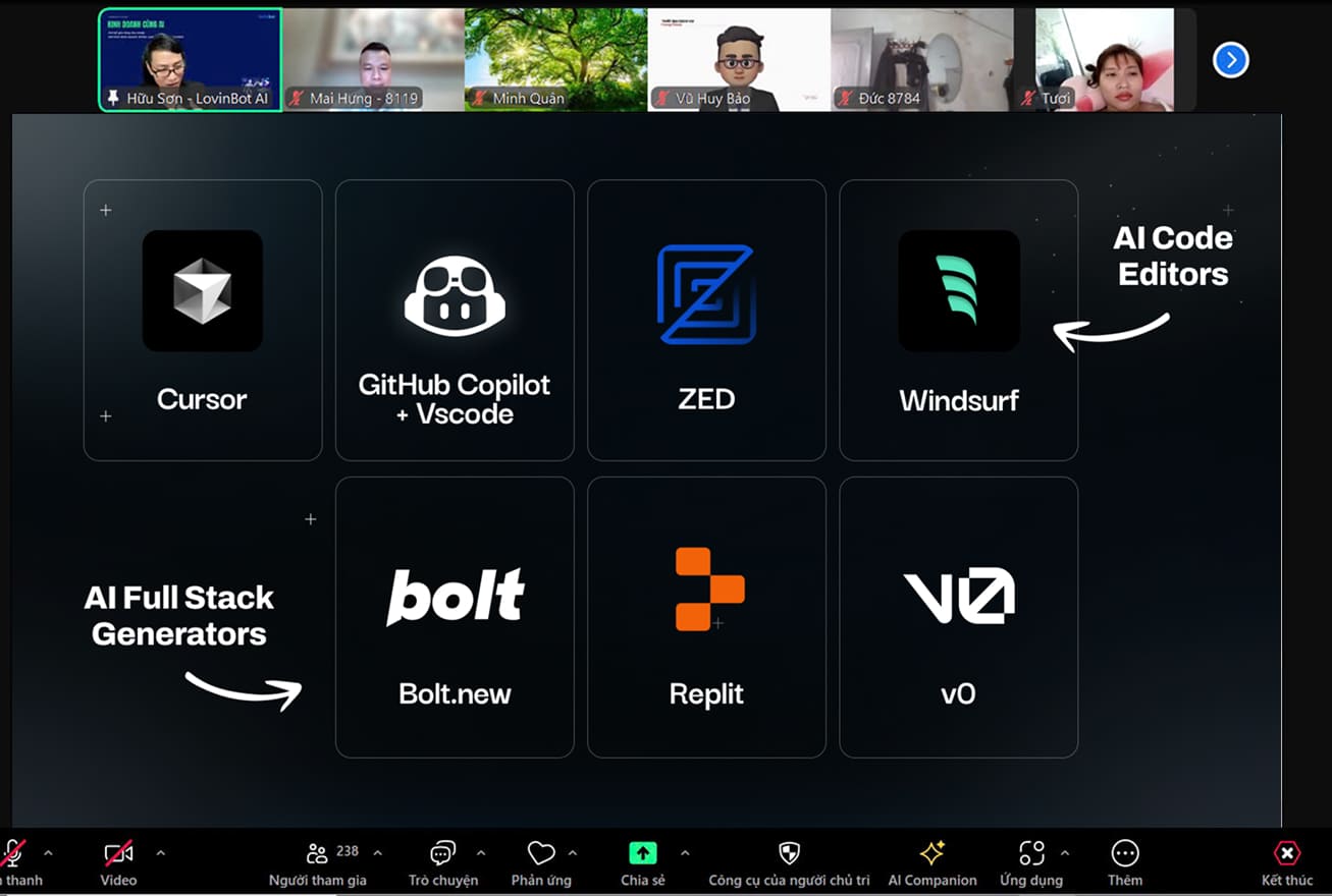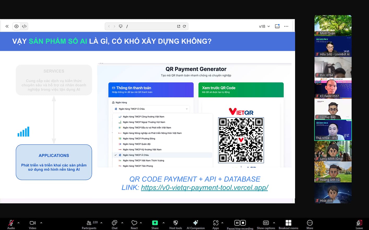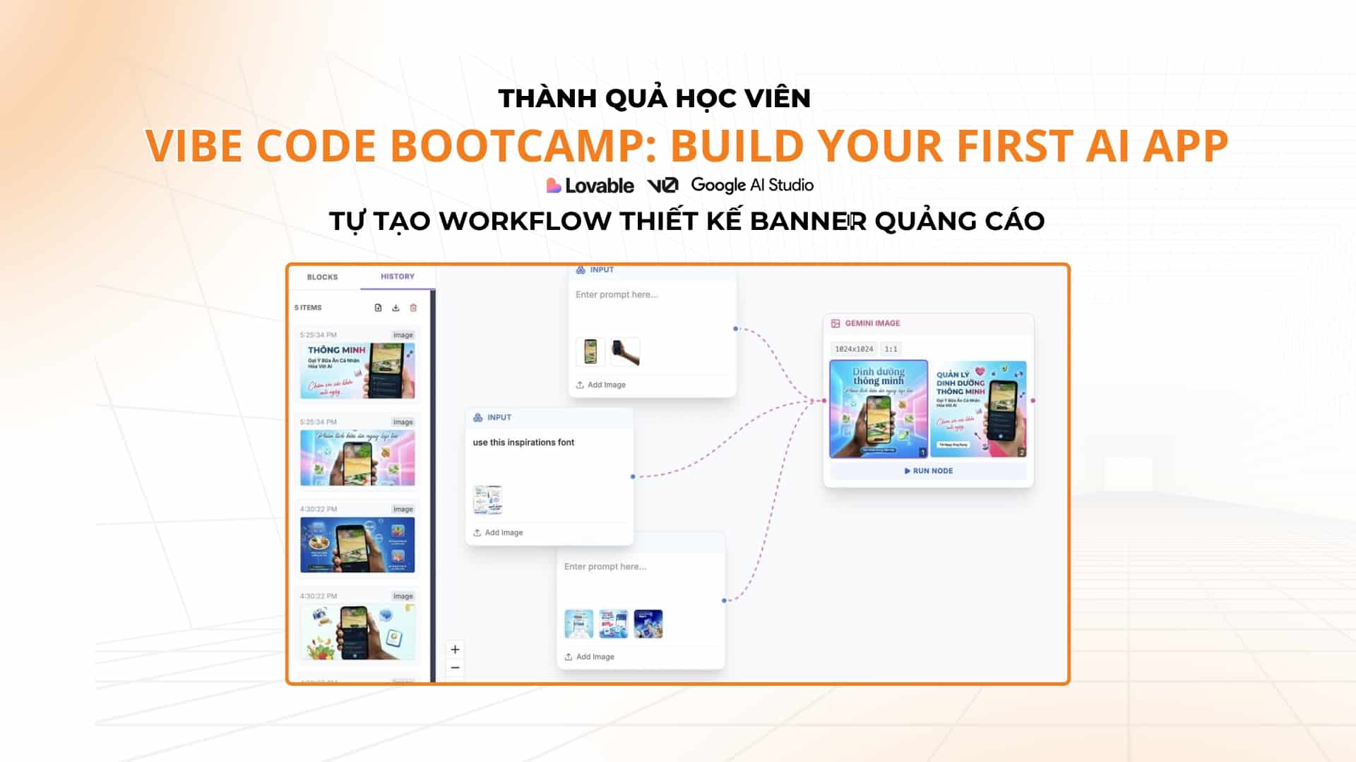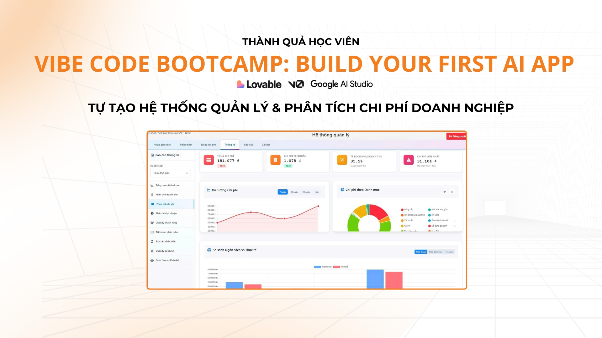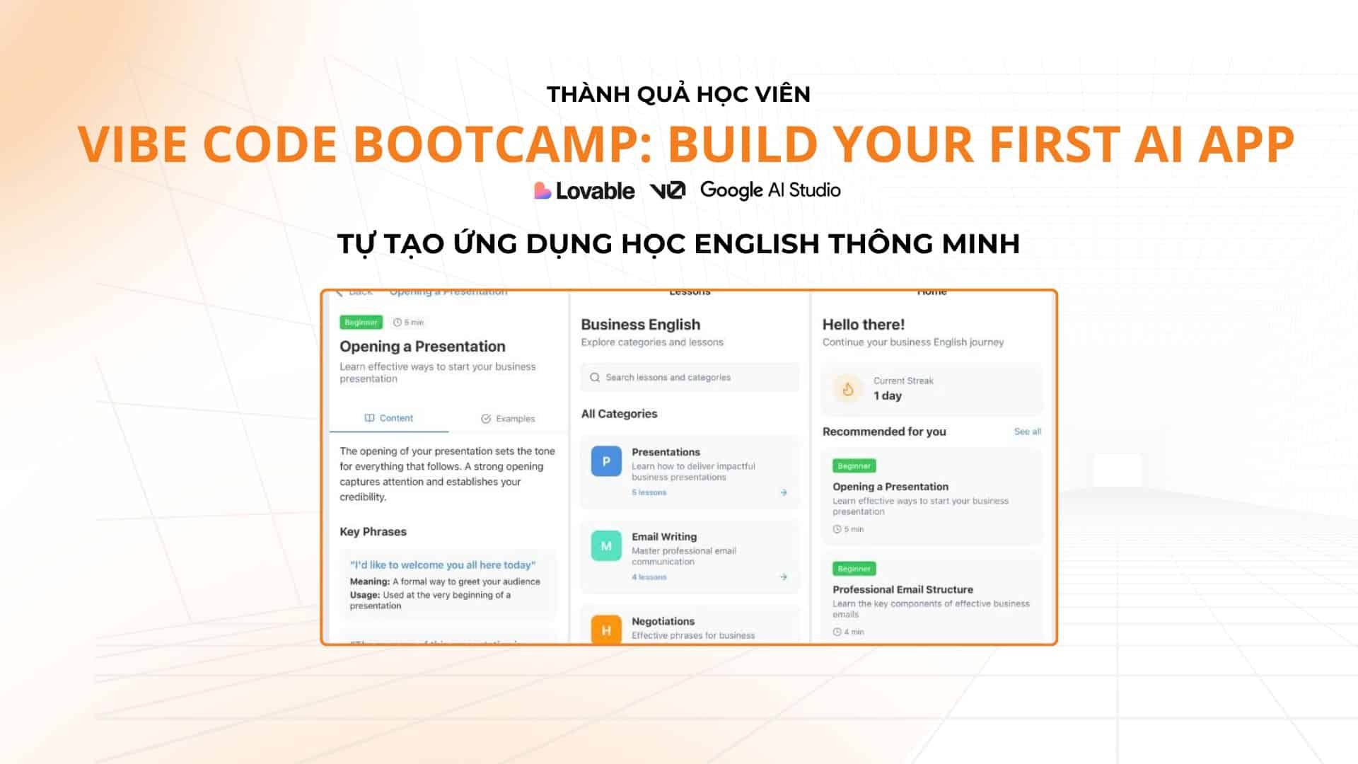 Khóa học dành cho bất kỳ ai muốn tự tạo ứng dụng AI thực tế, xây tool/website nhanh, ứng dụng AI vào công việc – đào tạo – kinh doanh, không cần biết lập trình.