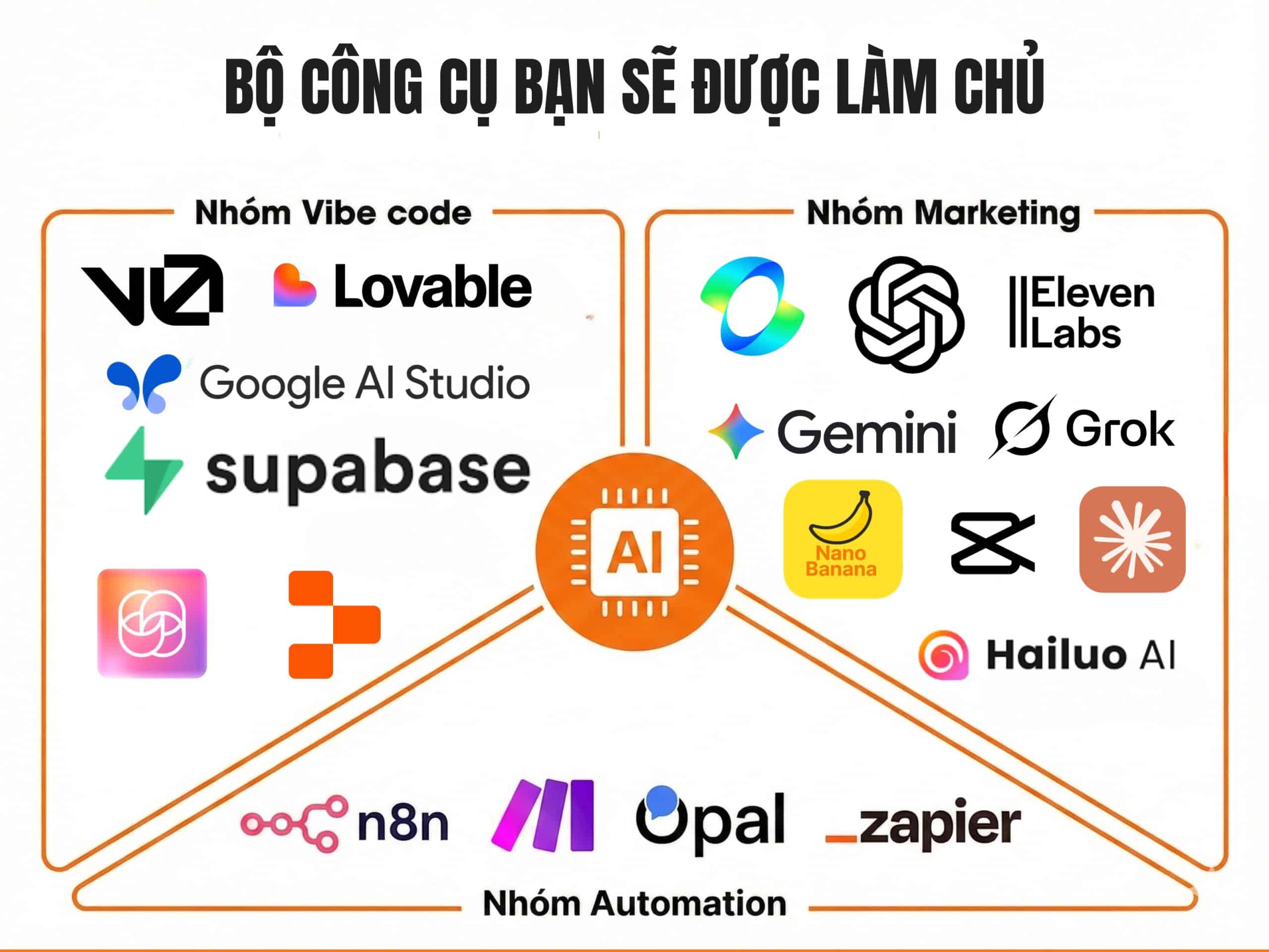Nano Banana Pro(Ảnh), Veo3, Kling (Video), ElevenLabs (Voice), ChatGPT/Claude.