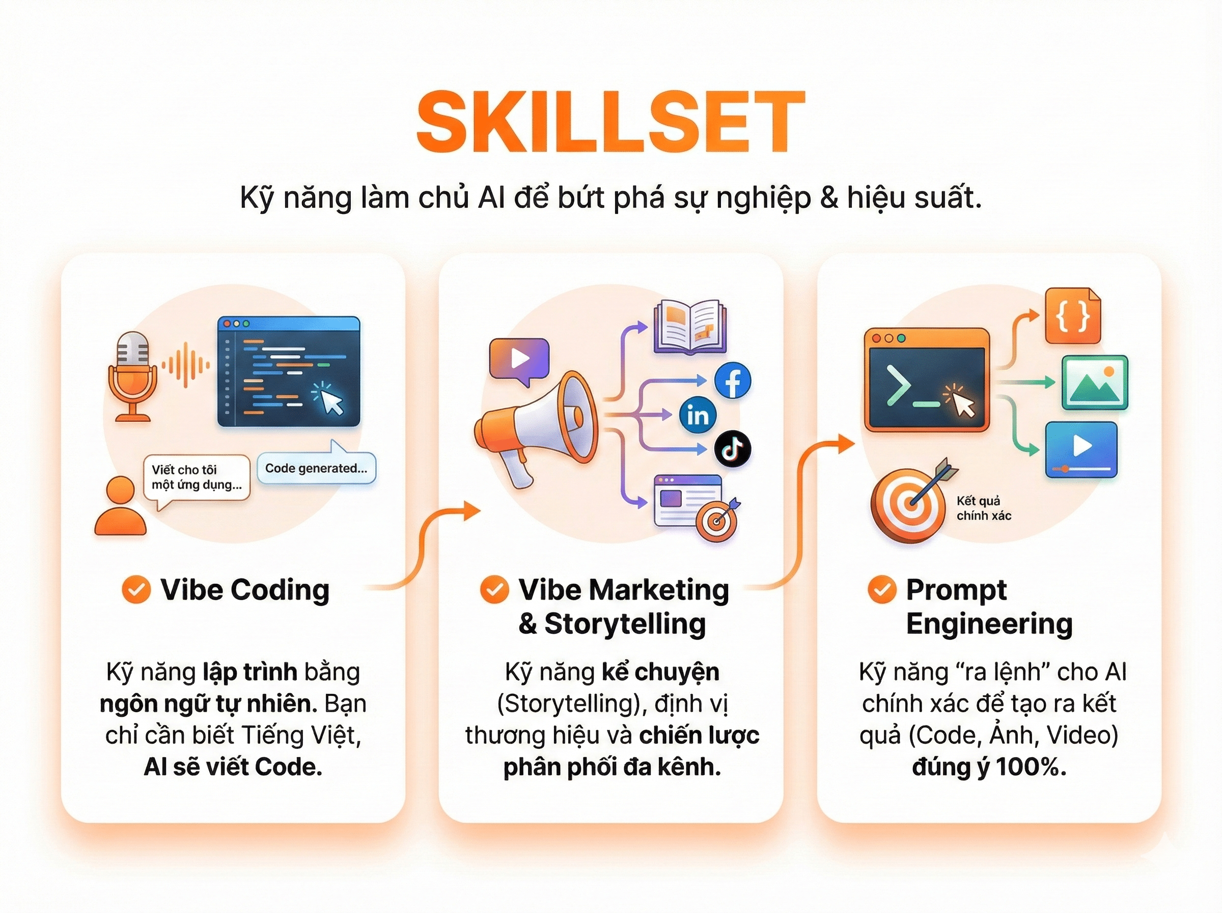 Chương trình đào tạo thực chiến giúp bạn sở hữu trọn bộ năng lực: Tự xây dựng ứng dụng (Vibe Coding) và Ứng dụng AI trong Marketing (Vibe Marketing).
